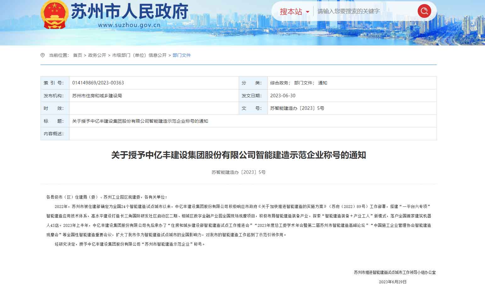 示范引领,科技创新,中亿丰被授予“智能建造示范企业”称号。